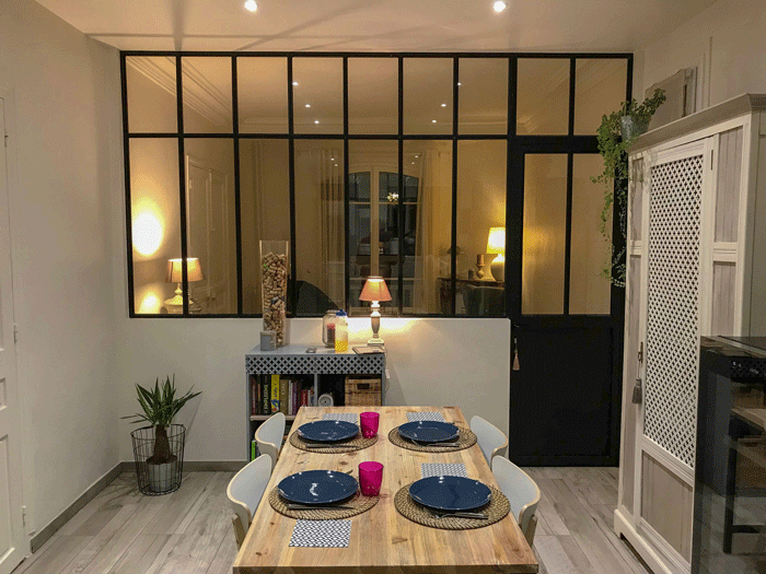 Fourniture et pose d'un verrier style Atelier entre la cuisine et la salle à manger.